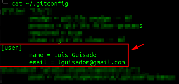 En la imagen podemos ver el resultado de aplicar el comando anterior. Se incluyó automáticamente en el archivo ~/.gitconfig la entrada [user] con el name y email establecido como global.