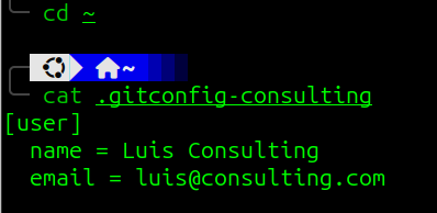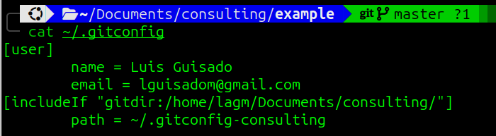 Si estamos en cualquier carpeta dentro de:/home/lagm/Documents/consulting/ Git incluirá automáticamente el archivo ~/.gitconfig-consulting con los datos de user y email establecidos.