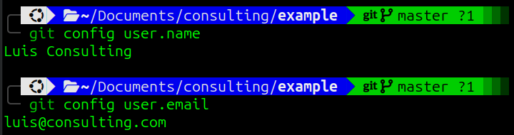 Por ejemplo, creamos una subcarpeta example e inicializamos un repositorio git con git init. Luego, podremos verificar que git detecta las configuraciones esperadas al ejecutar git config user.name o git config user.email.