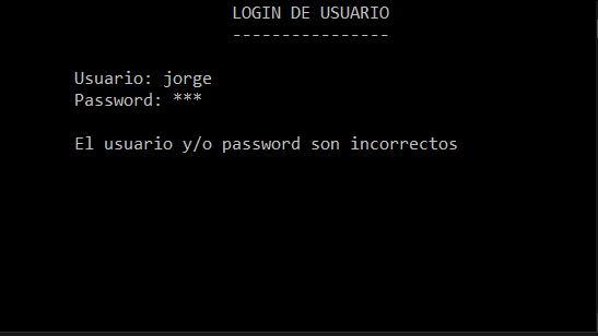 Como podrás apreciar en la imagen, al ingresar la contraseña, ésta aparece en astericos como medida de seguridad. Cuando la clave es incorrecta, el programa muestra el mensaje “El usuario y/o password son incorrectos“. Se pulsa la tecla ENTER para volver a ingresar el usuario y la contraseña.