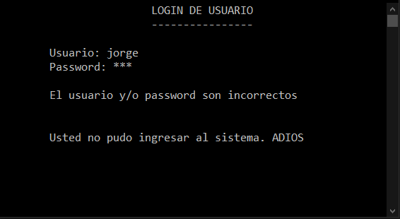 El programa solo admite un máximo de 2 equivocaciones. Si se sobrepasa este límite, el programa te mostrará el mensaje de despedida: “Usted no pudo ingresar al sistema. ADIOS” y luego se cerrará.