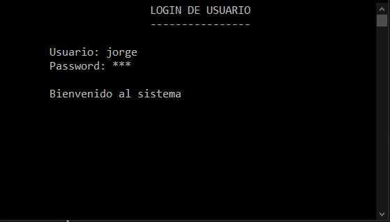 Cuando se ingresan las credenciales correctamente, el programa mostrará el mensaje de bienvenida: “Bienvenido al sistema“.