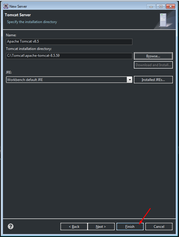 Una vez que hemos seleccionado la carpeta de Tomcat solo nos queda hacer clic en el botón «Finish»