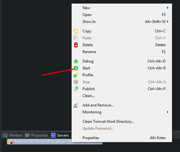 Para iniciar el servidor y probar que funcione correctamente hacemos clic derecho sobre él y luego elegimos la opción «Start»