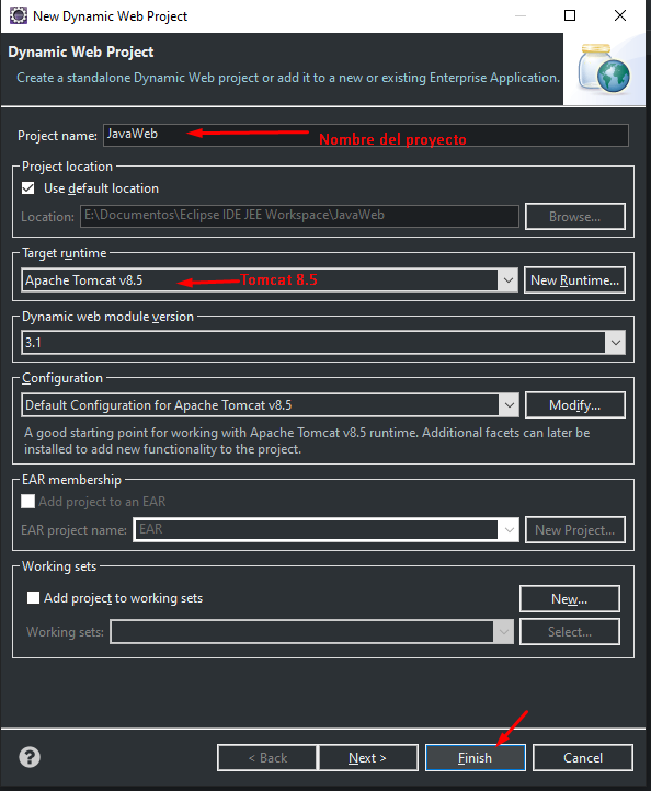 En Target runtime debemos asegurarnos de que se encuentre seleccionado Apache Tomcat v8.5 el cual ya fue configurado en pasos anteriores. Luego damos clic en el botón «Finish«.
