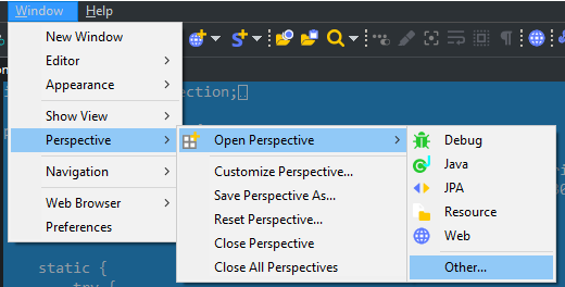 Antes de continuar, vamos a asegurarnos de que nuestro IDE Eclipse esté situado en la perspectiva Java EE. Para ello, hacemos clic en el menú Window / Perspective / Open Perspective / Other…