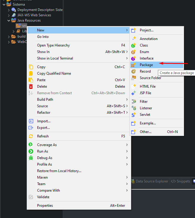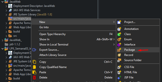 Haremos clic derecho en la carpeta src y elegimos New / Package.