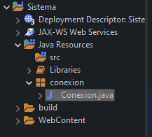Crearemos un paquete llamado «conexion» y dentro de ella una clase java llamada Conexion que tendrá el código para realizar la conexión con la base de datos que creamos al inicio. Esta clase será reutilizada en varias partes de nuestro proyecto java web.