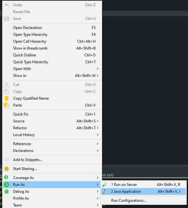 Para ejecutar esta última clase TConexion, hacemos clic derecho sobre la clase TConexion y elegimos Run As/Java Application