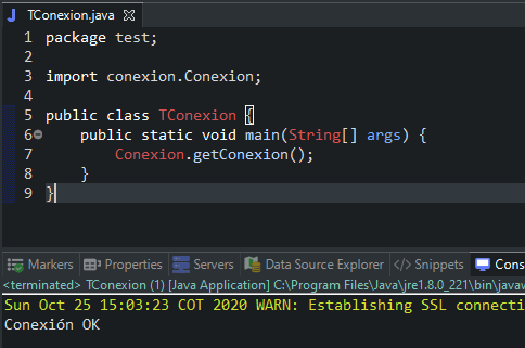 Temporalmente crearemos un paquete llamado «test» y dentro una clase java de prueba llamada TConexion.java con la cual probaremos que la clase Conexion permita realizar conexiones existosas con la base de datos bd_sistema.