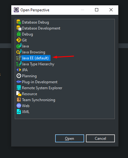 Aparecerá una ventana llamada Open Perspective en la cual seleccionaremos la opción Java EE (default) y por último damos clic en el botón Open.
