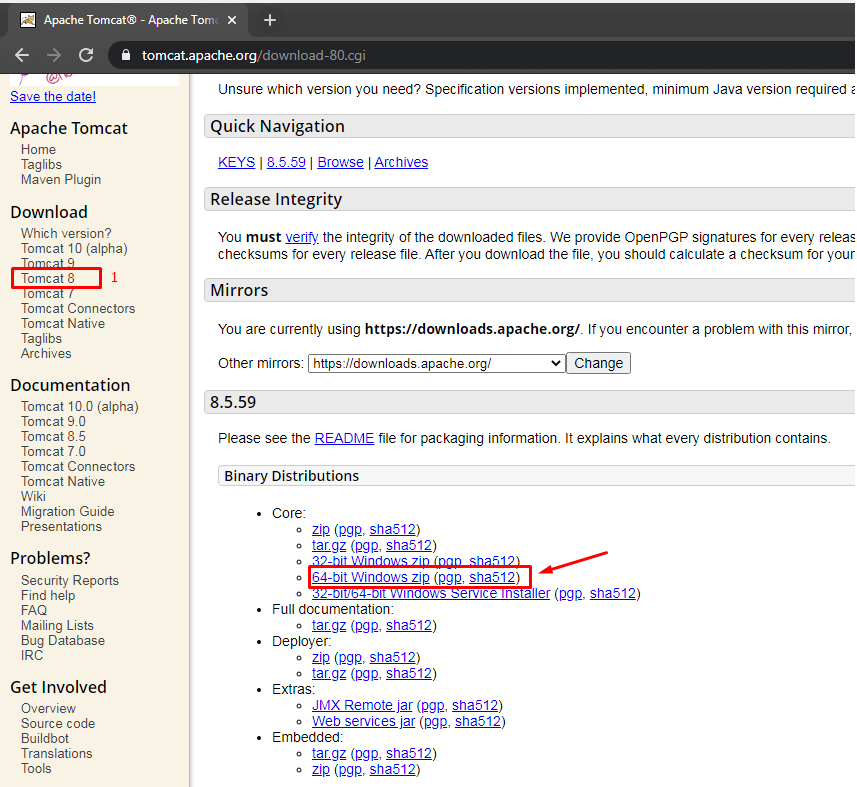 Dentro de 8.5.59 Habrá una subzona llamada Binary Distributions la cual a su vez tiene varias secciones: Core, Full documentation, deployer, extras, etc. Los links que nos interesan se ubican en la sección Core. Allí vamos a elegir entre descargar la versión de 32 o 64 bits. Para este tutorial usaremos la de 64 bits por lo tanto haremos clic en 64-bit Windows zip (pgp, sha512) para que empiece la descarga.