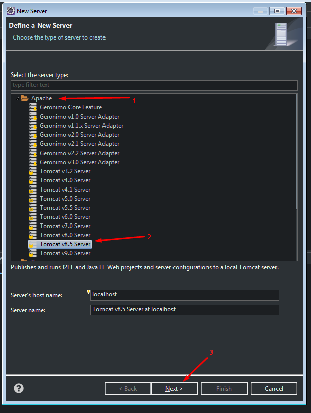 Se nos abrirá una ventana llamada «New Server«. Nos dirigimos hacia la lista de tipos de servidores y buscaremos el que diga «Apache», hacemos clic en él para desplegar la sublista y seleccionaremos la opción «Tomcar v8.5 Server» para posteriormente hacer clic en el botón Next.