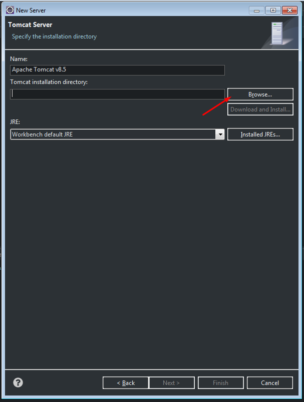 Ahora damos clic en el botón «Browse» para poder seleccionar la ruta donde se encuentra la carpeta descomprimida de Tomcat que acabamos de descargar.