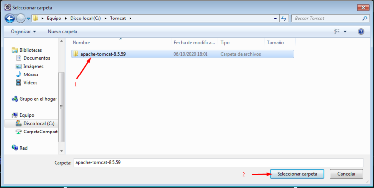 Nos ubicamos en la carpeta descomprimida de Tomcat y luego hacemos clic en el botón «Seleccionar carpeta»